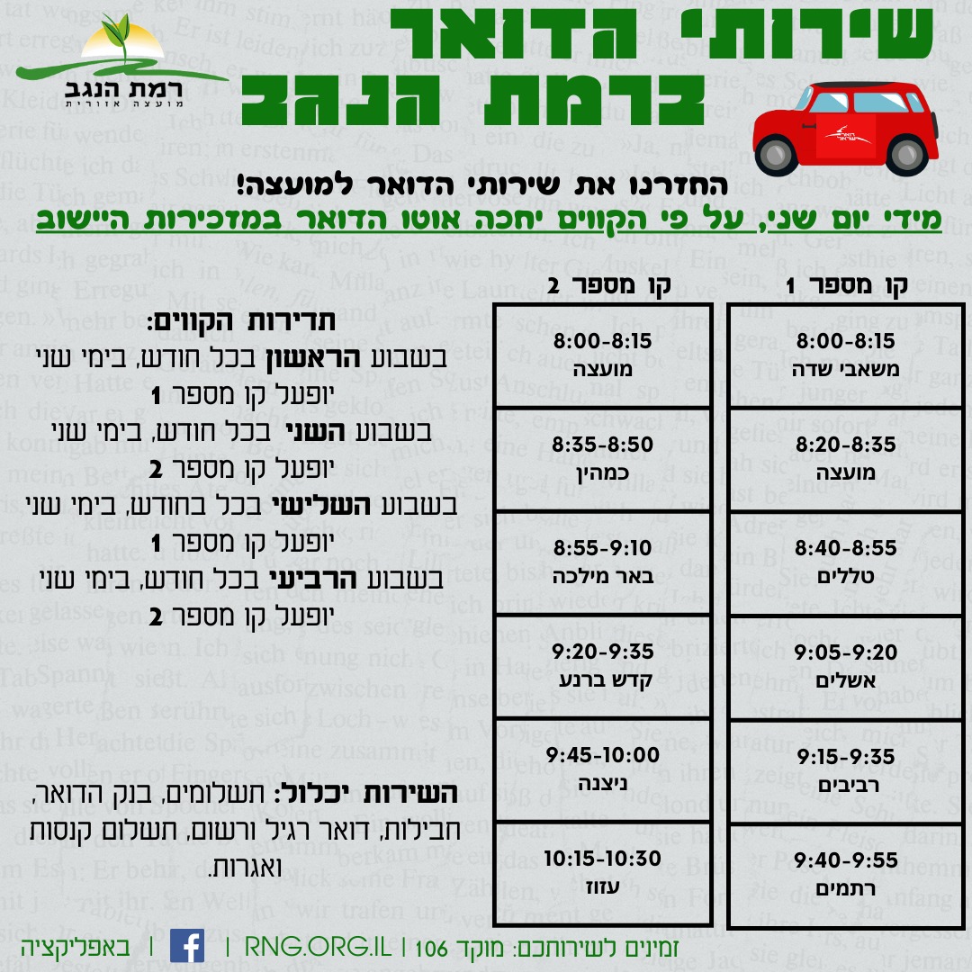 החל מיום שני הקרוב 11.09 (מחר), אוטו הדואר יעבור ביישובים (ביום שני הקרוב, השבוע השני בחודש ועל כן, יפעל קו 2)